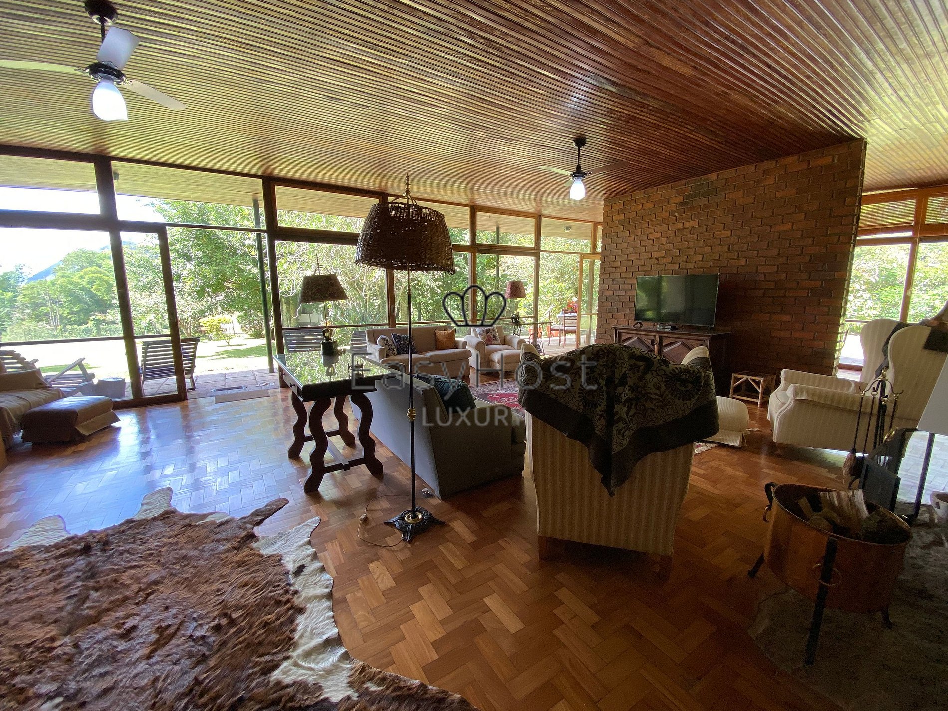 Completely surrounded by the Atlantic Forest, the house has 8,000m of private lawn, a swimming pool, barbecue area, private Finnish sauna, post-sauna pressure shower and ample outdoor leisure areas, including hammocks, a garden fireplace and a helipad.