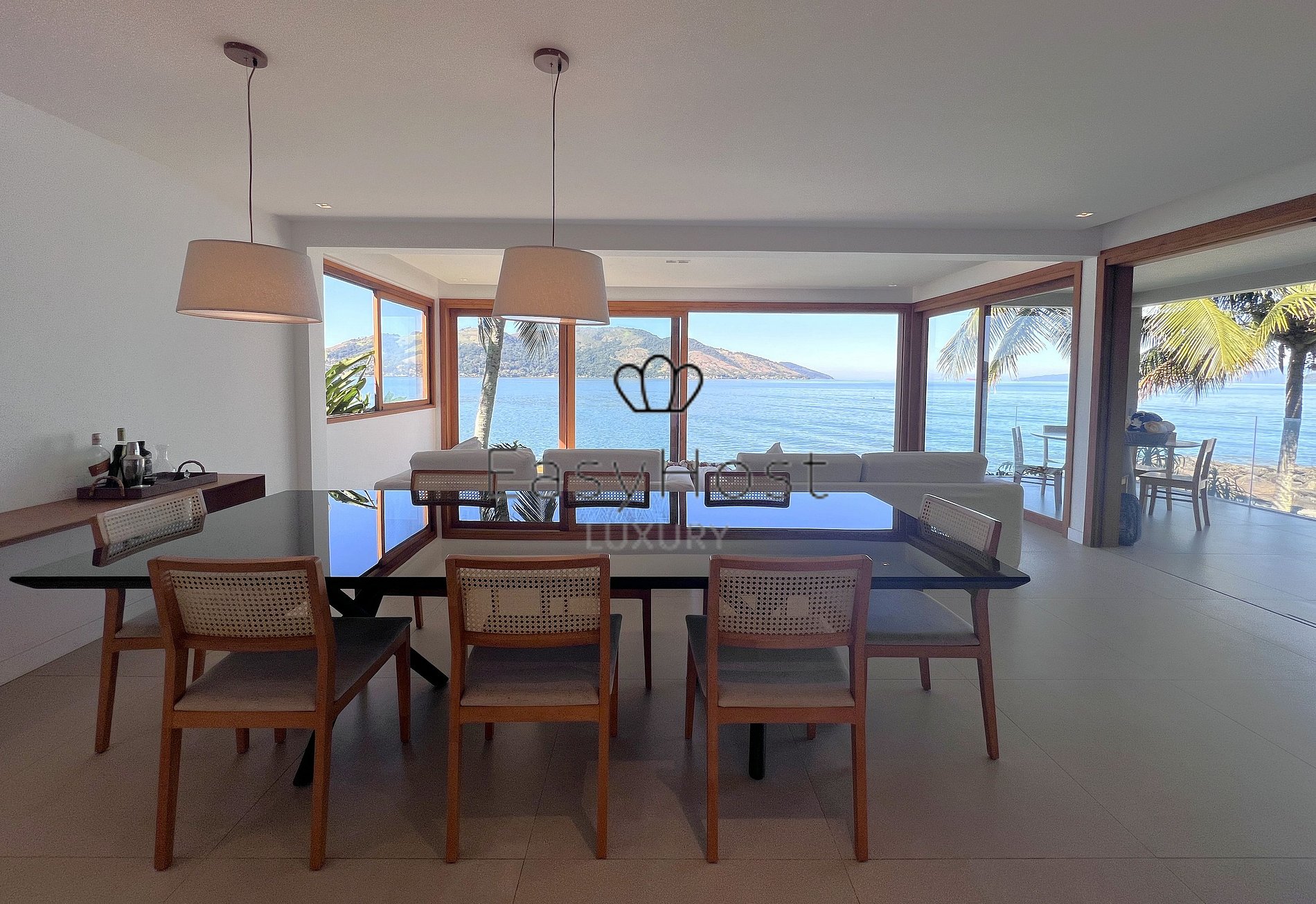 The open-concept living room harmoniously connects to the veranda and outdoor area, creating a spacious social area that values natural light and the stunning bay views.