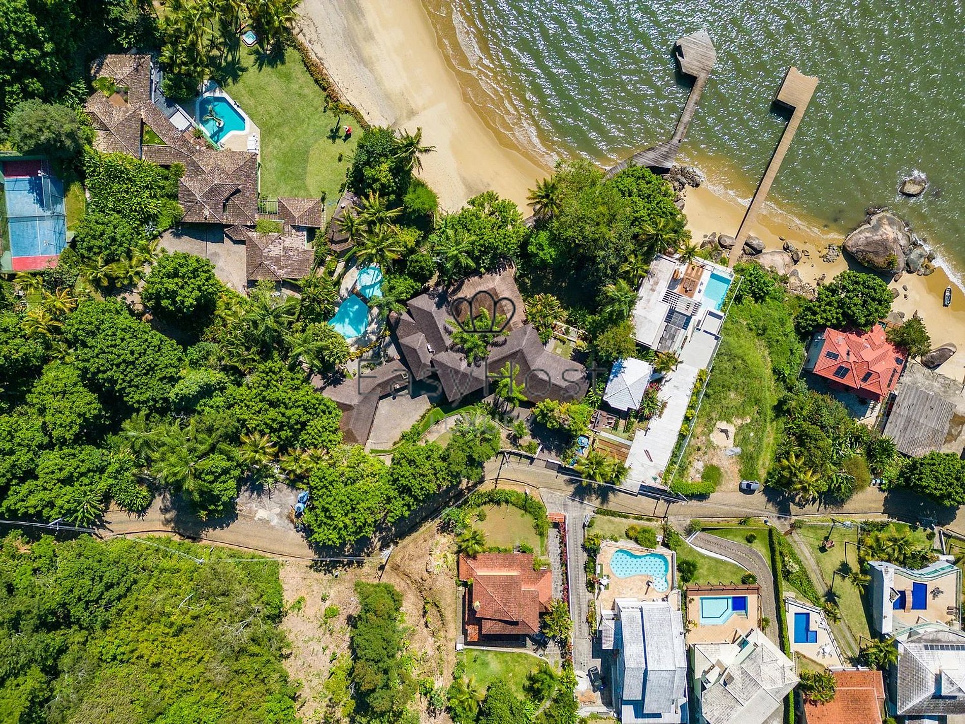 Con una área total de 2.000m² e 800 m² de área construida, esta hermosa mansión fue diseñada por un arquitecto y tiene una total integración con la naturaleza, siendo extremadamente cómodo y lujoso La casa cuenta con 08 suites, todas master, con piscina, sauna, zona gourmet, sala de TV, sala de juegos, cocina completa y playa privada del condominio.