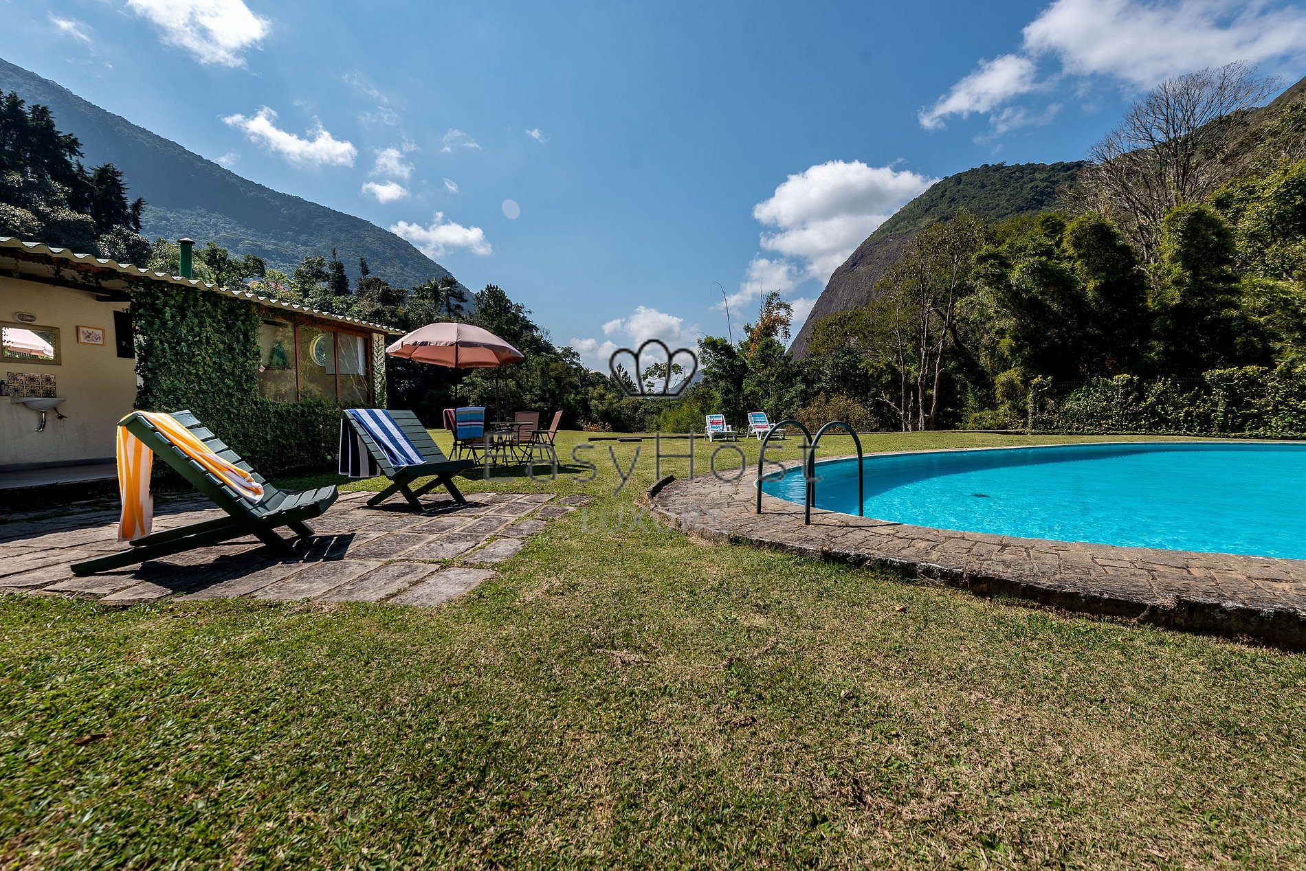 A parte externa da casa é muito boa e espaçosa com uma boa área de piscina e churrasqueira, além de uma vista linda para as montanhas da região.